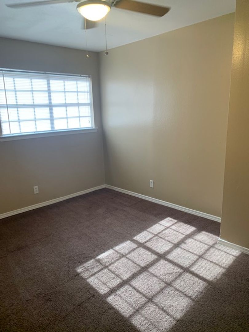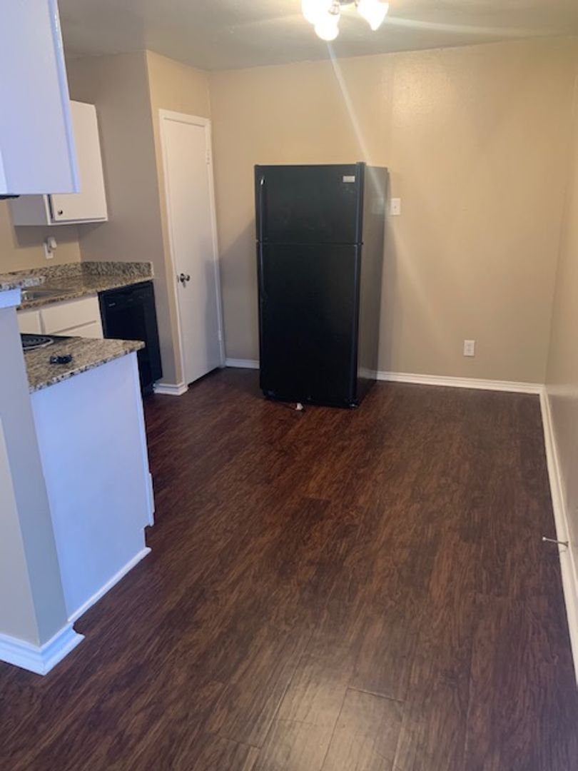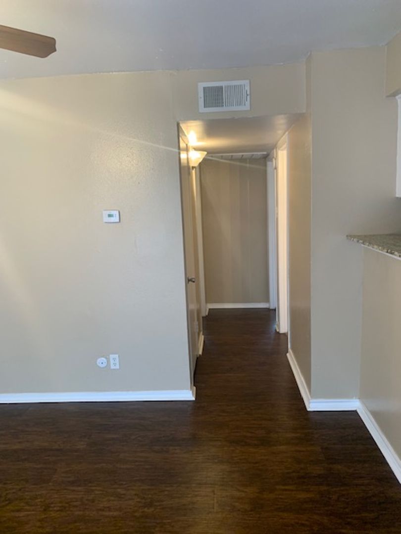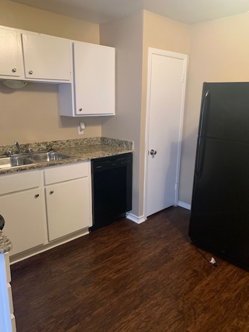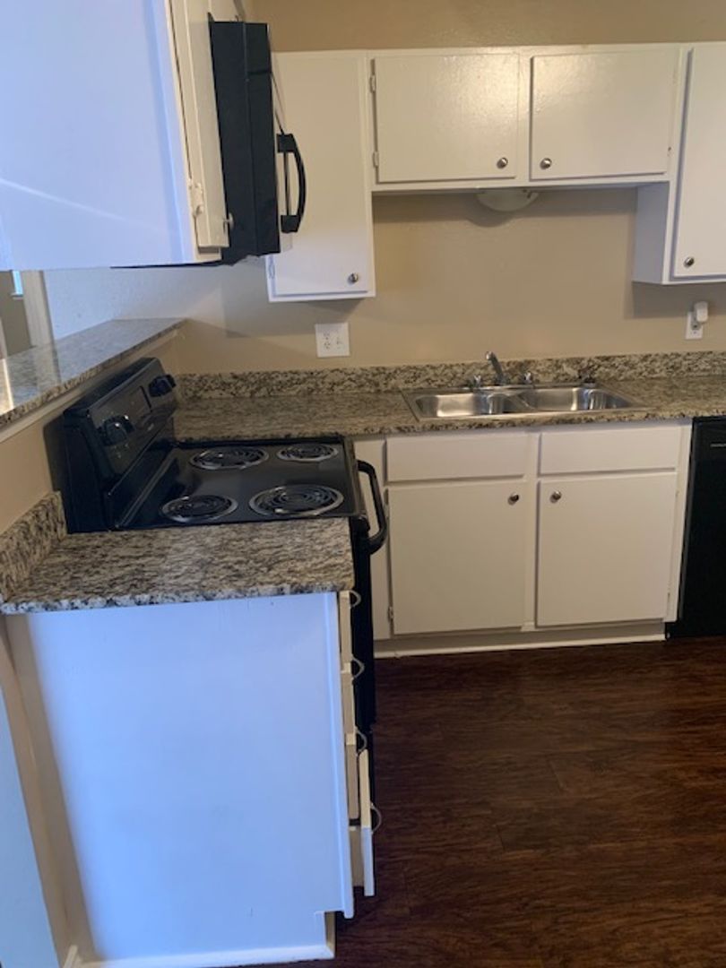 This is an upstairs unit, vinyl wood flooring throughout unit, with tile in bathrooms and carpet in bedrooms only. 1/2 bath in main bedroom, walk-in closet in second bedroom, storage closets in both bedrooms, all black appliances in the kitchen with granite counter tops. Tenant is responsible for electric and cable/internet if wanted. We pay water and trash.